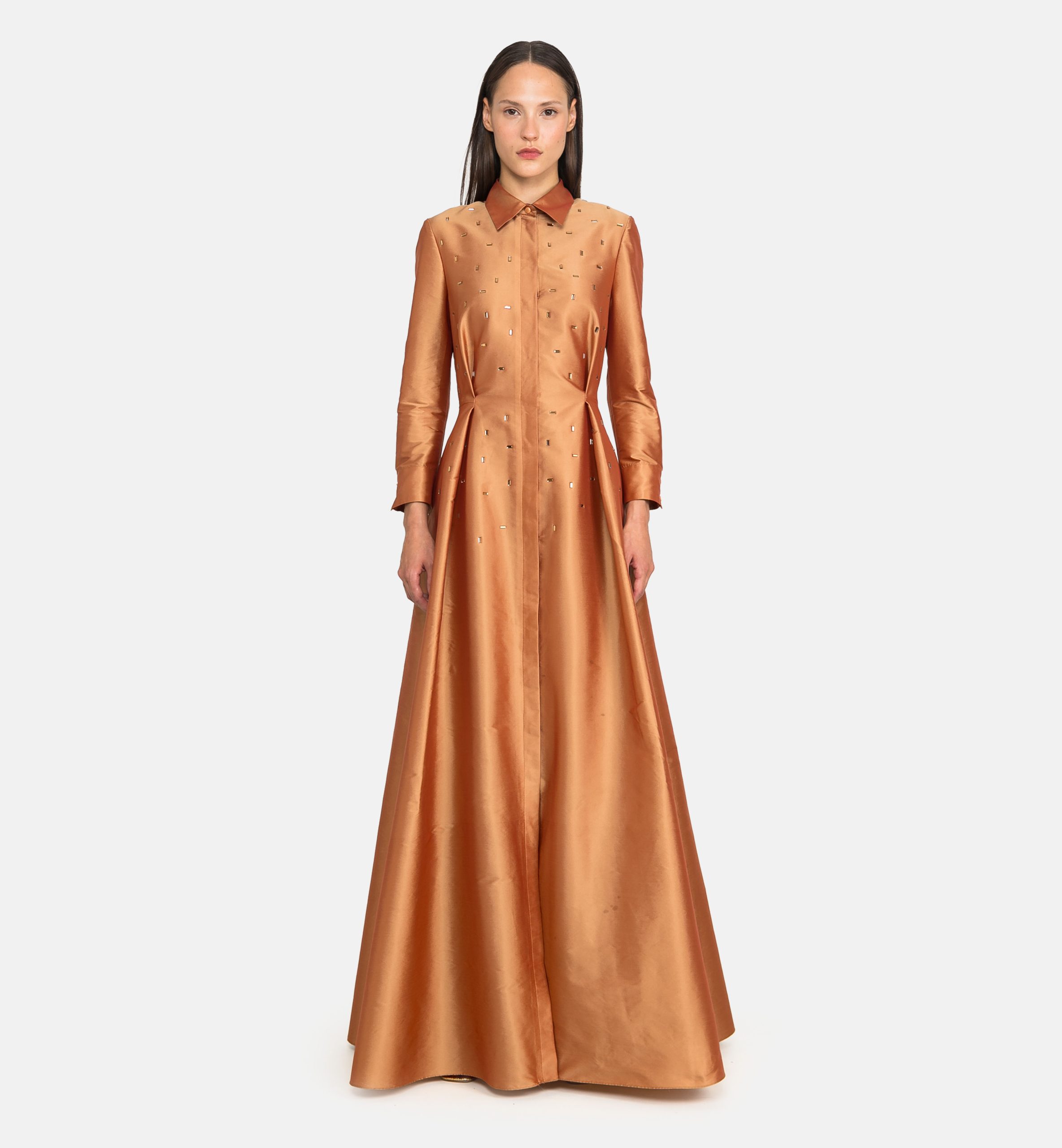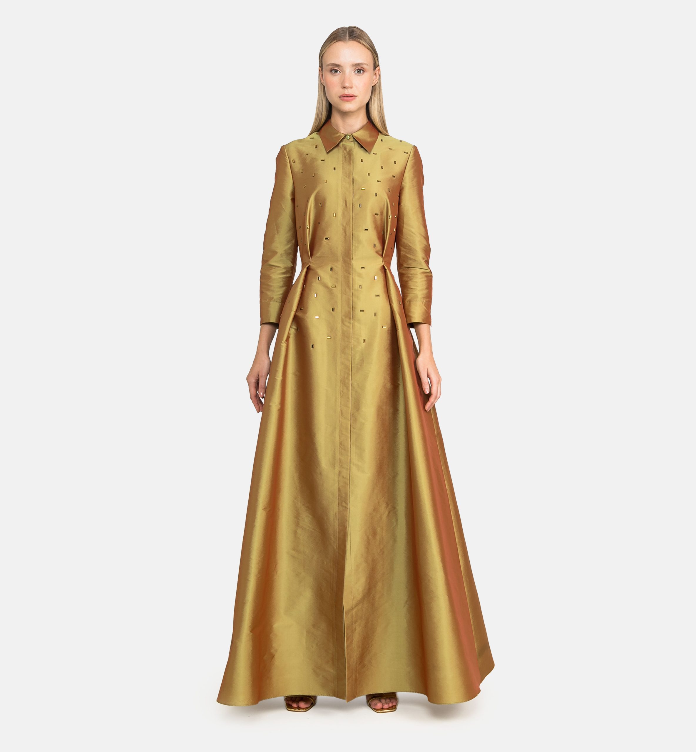 שמלה טפט מכופתרת מעוטרת אבנים מקסי, זהב