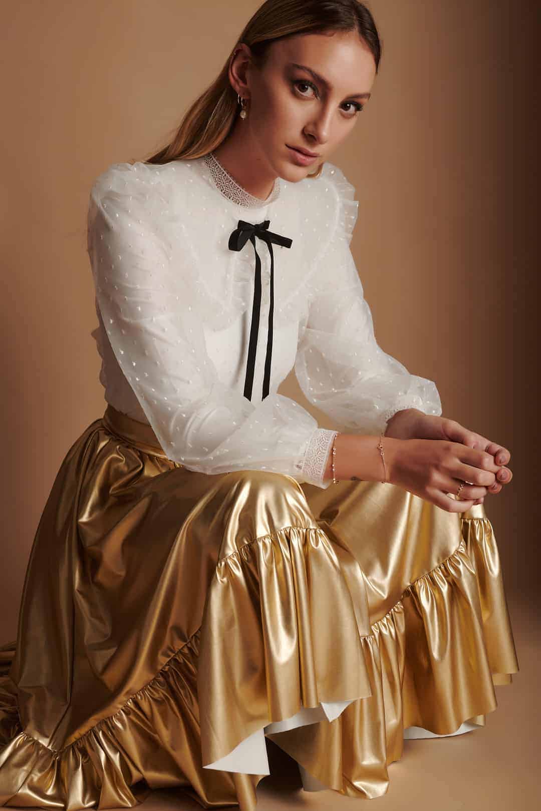ניתן להשלים את הלוק עם חולצת טול נקודות לבנה עם צווארון נקשר, זמינה לרכישה גם באתר.