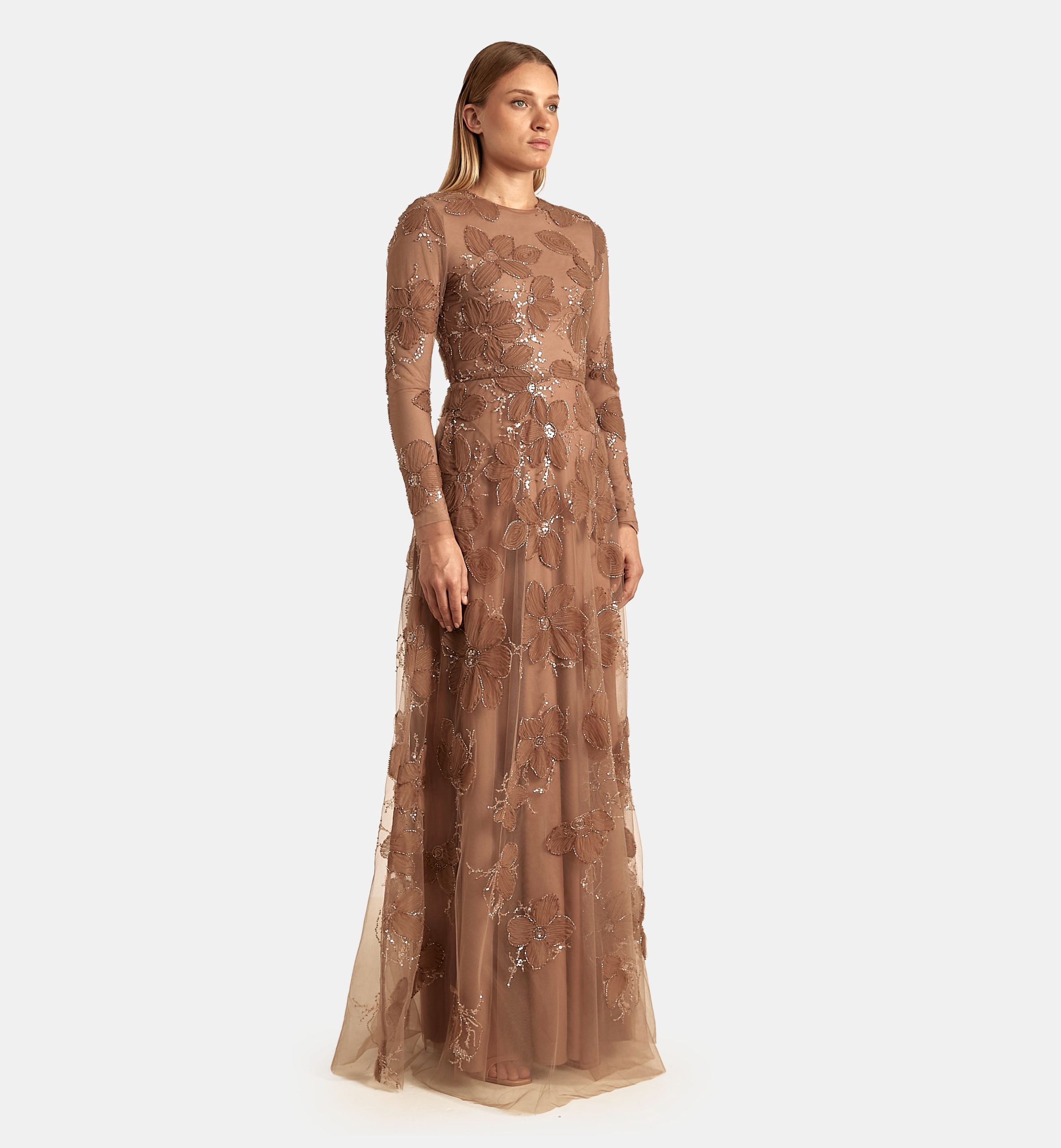 שמלה טול פרחים כפלי בד מקסי, חום
