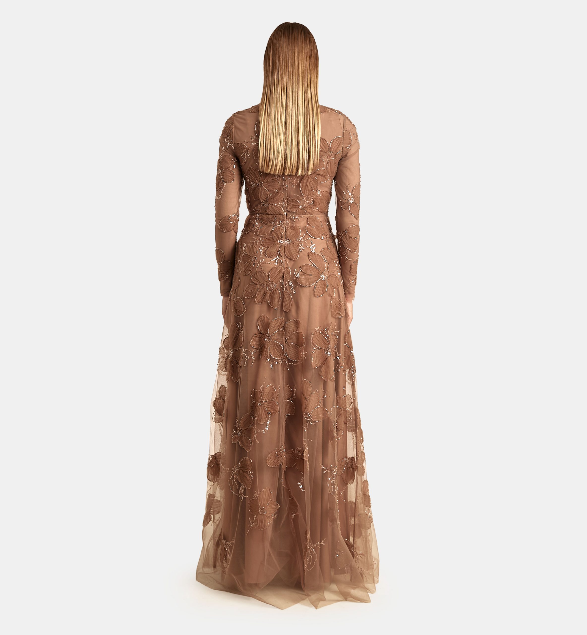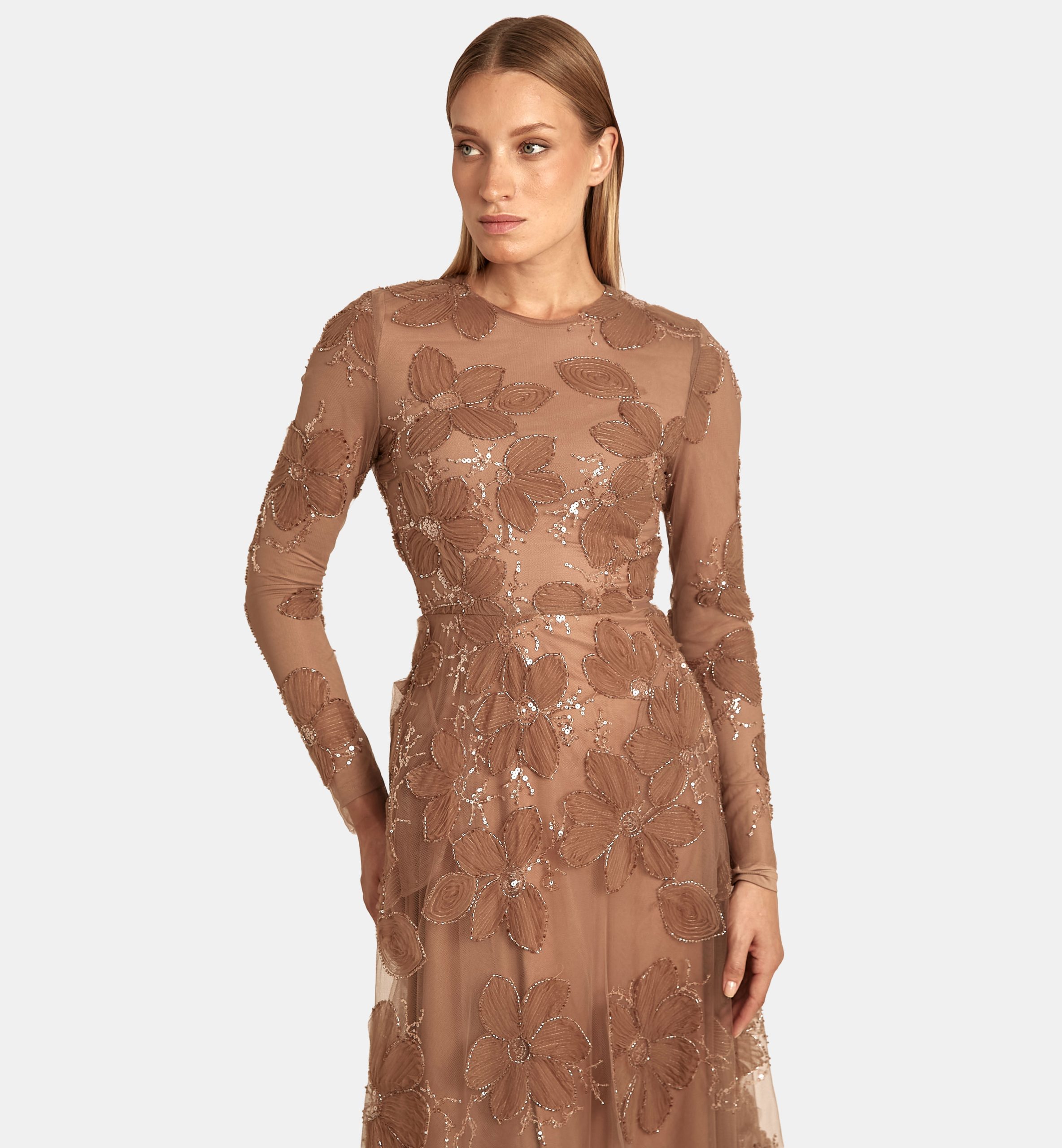 שמלה טול פרחים כפלי בד, חום