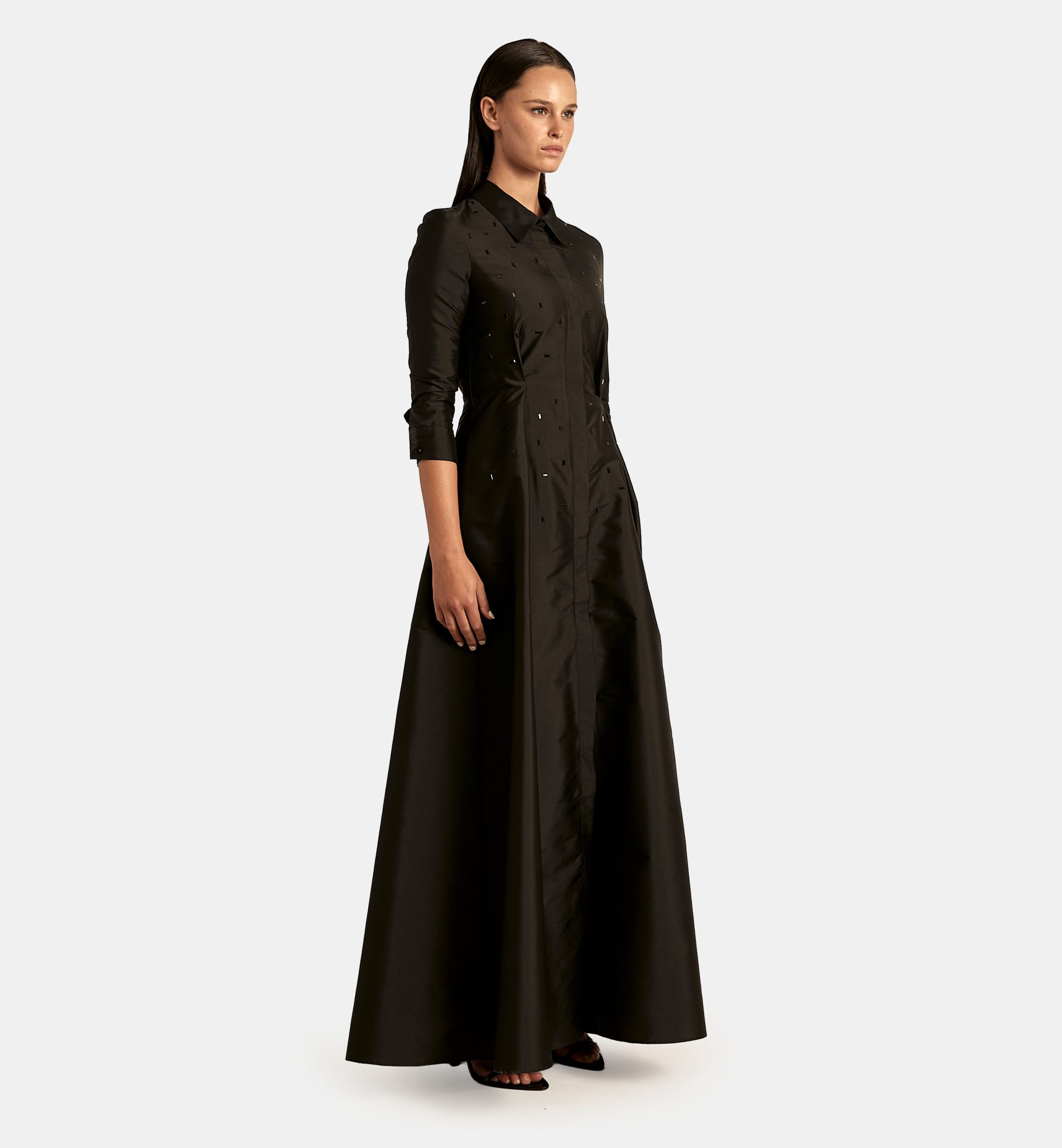 שמלה טפט מכופתרת מעוטרת אבנים מקסי, שחור