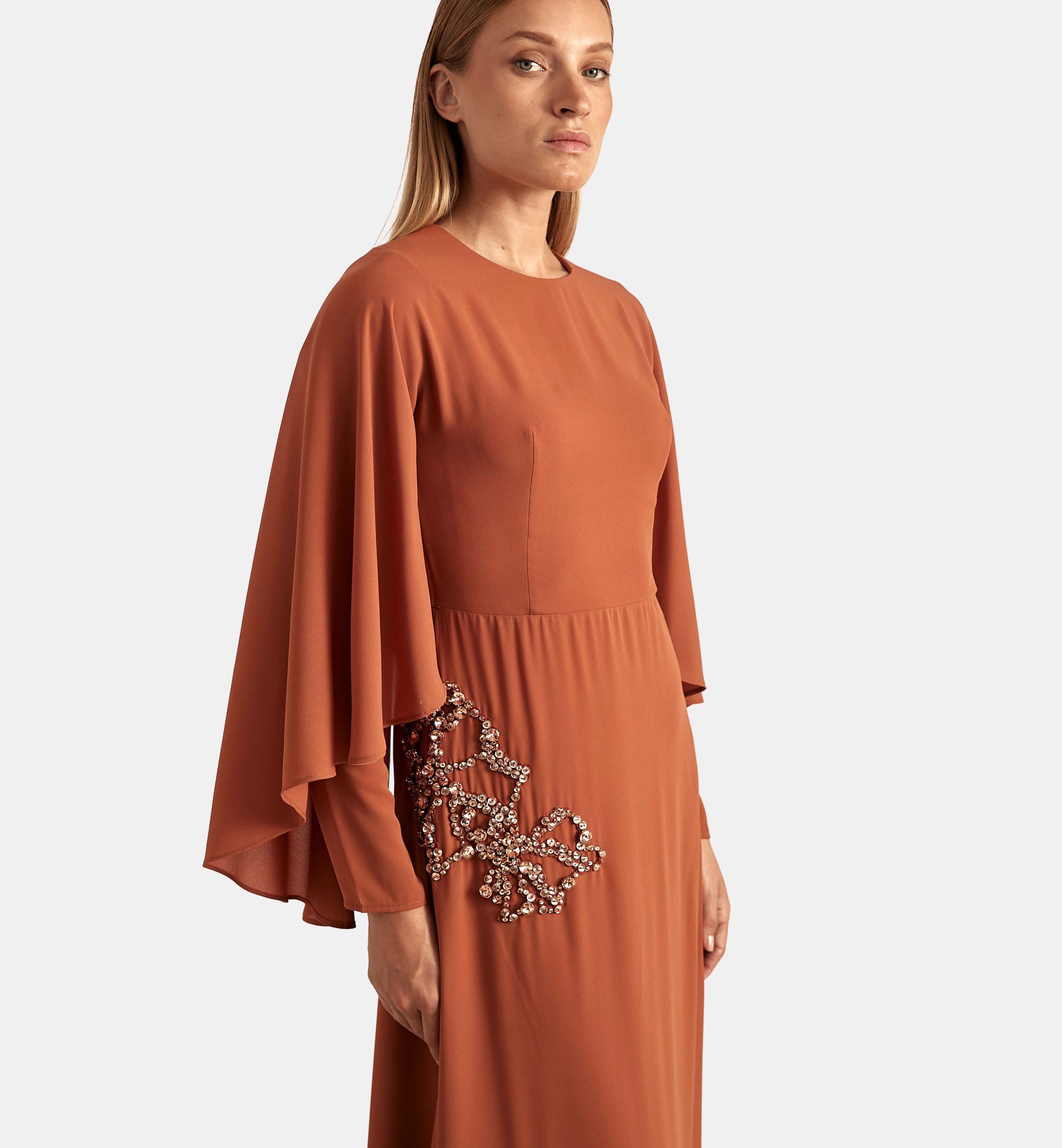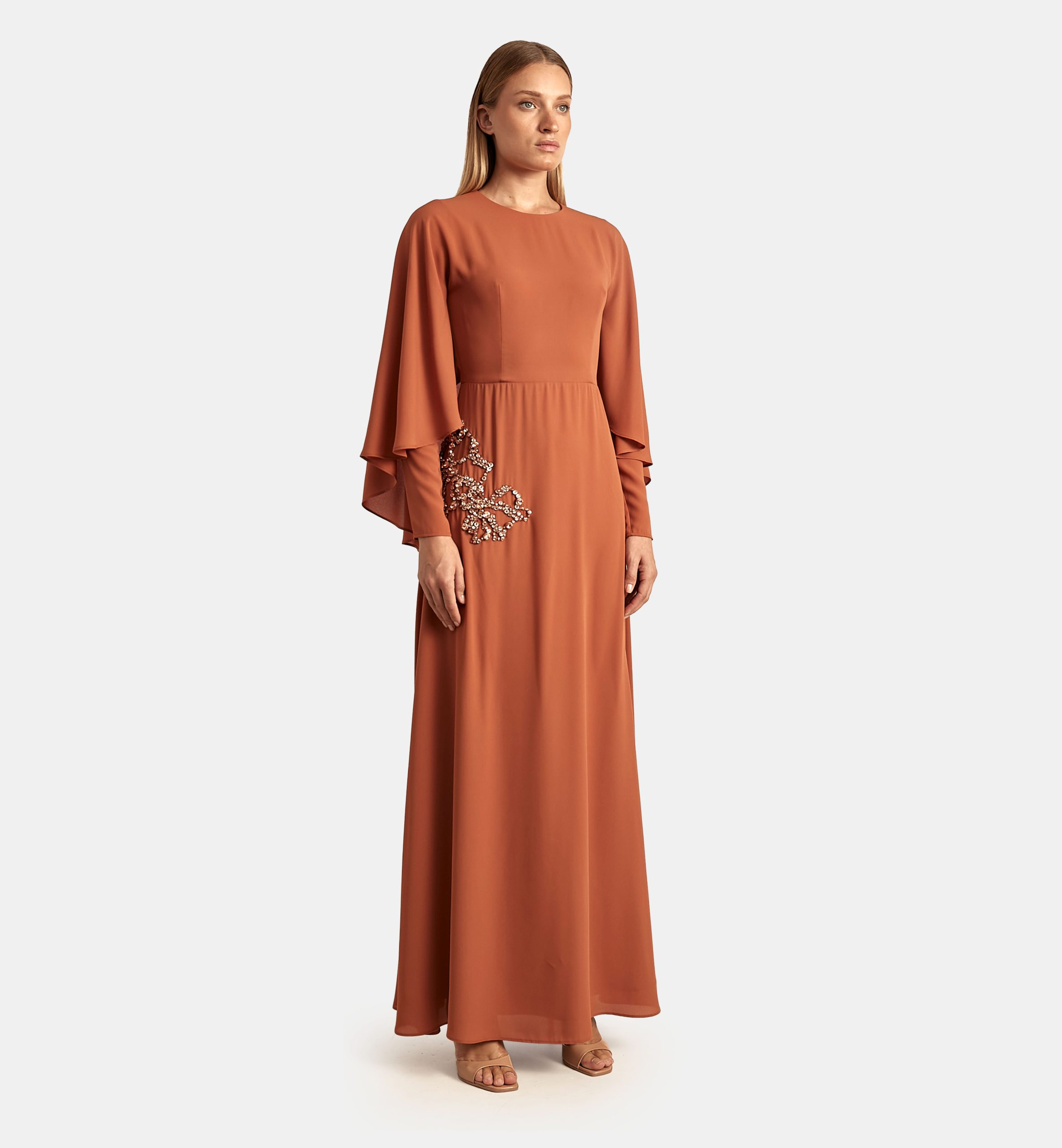 שמלה קרפ שכמיה מעוטרת אבנים מקסי, קאמל