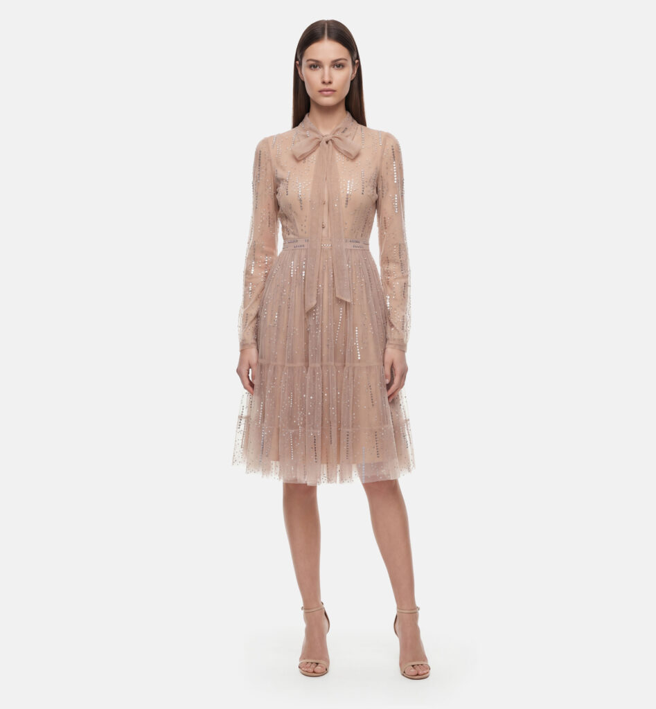 שמלת טול אבנים מכופתרת, בז׳
