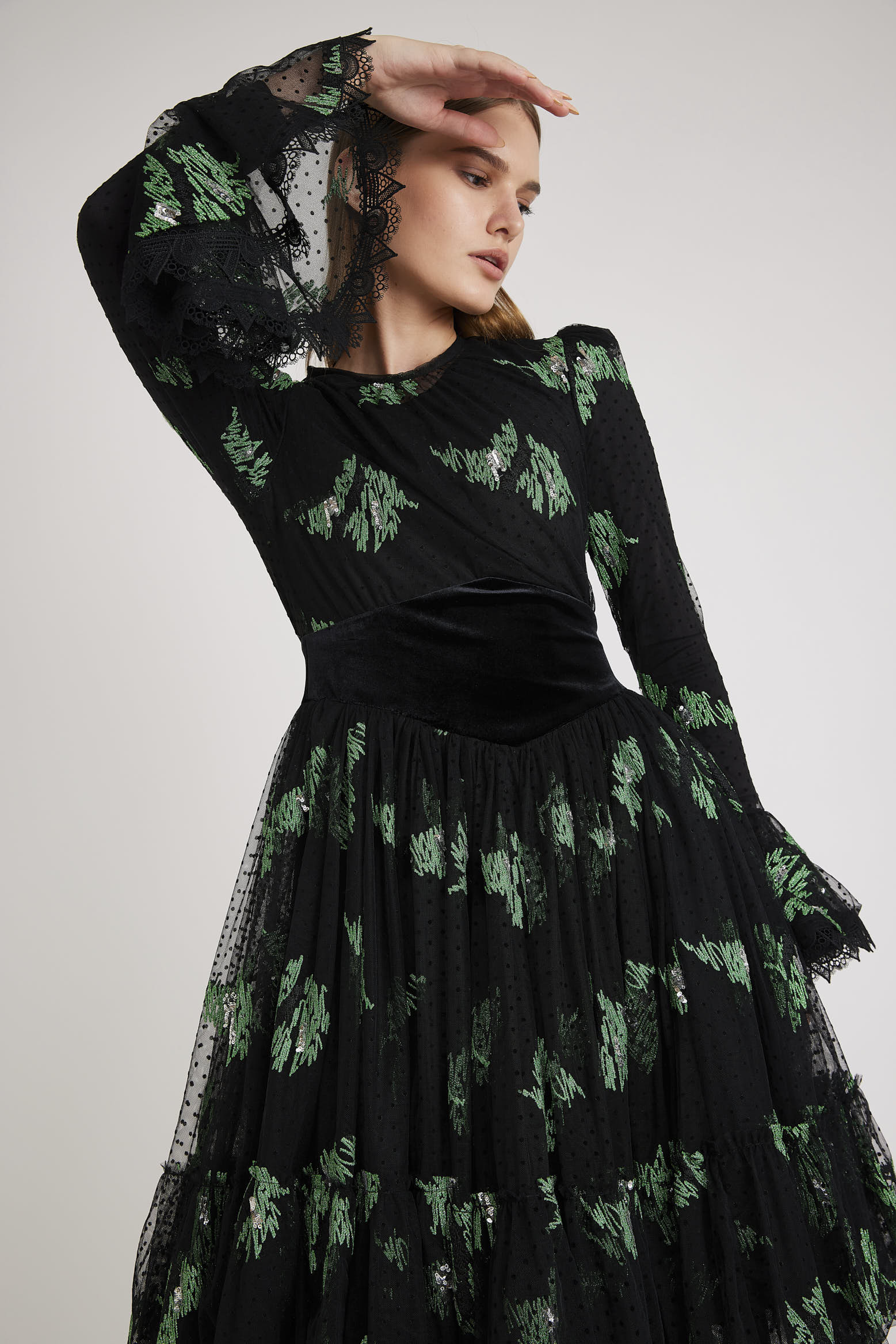 שמלת טול נקודות קטיפה וריקמת ברקים, שחור ירוק